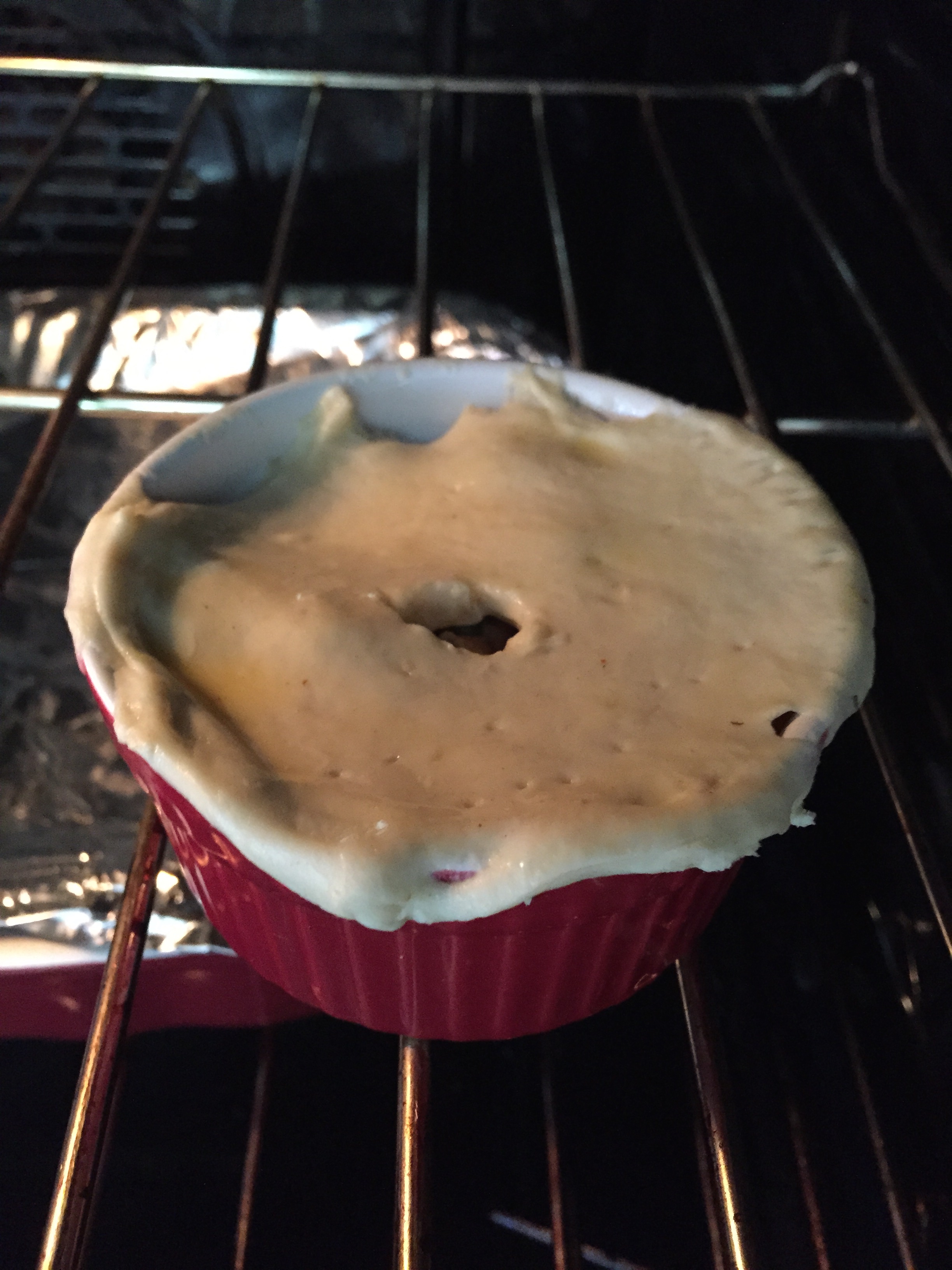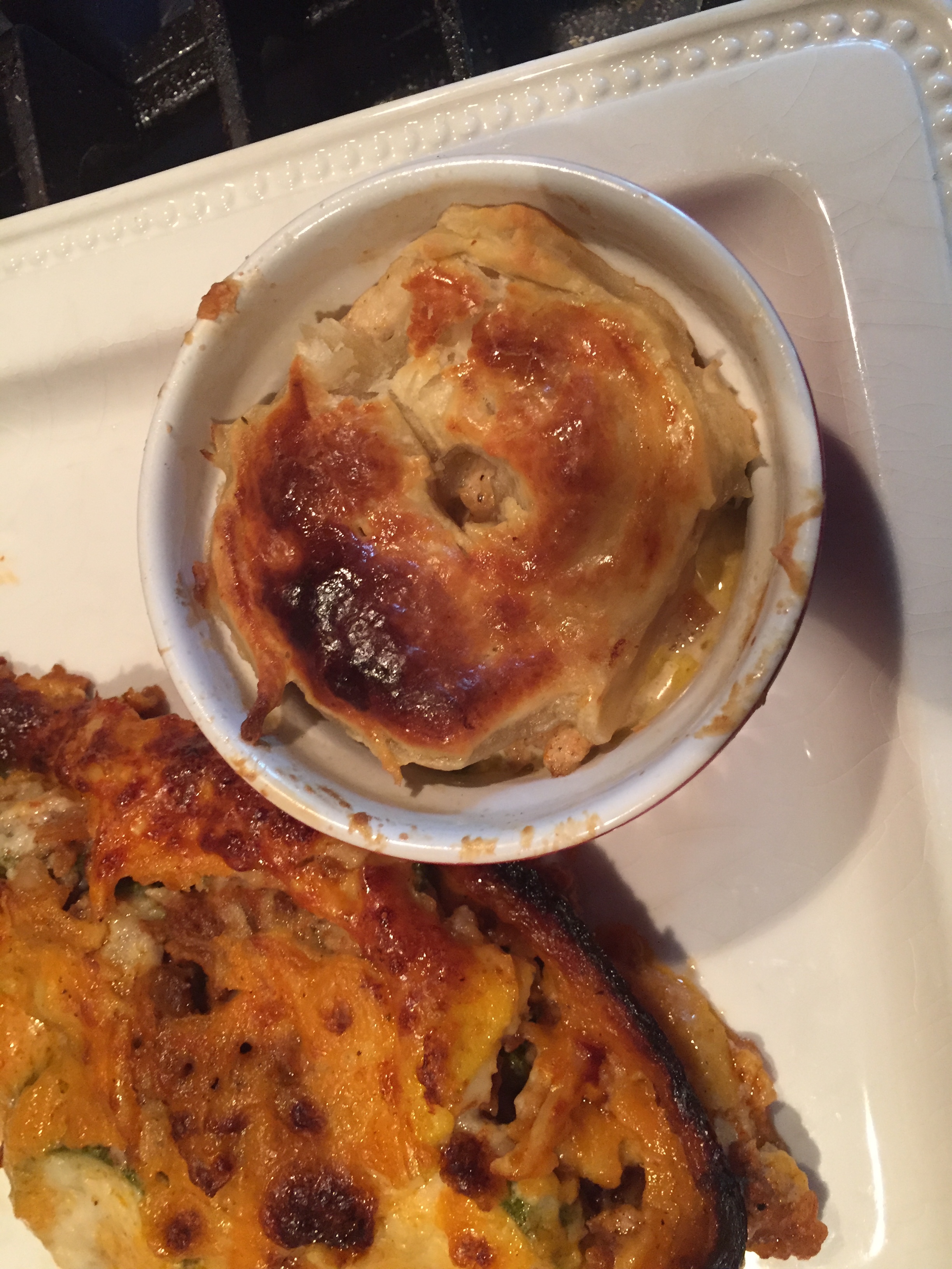 For the chicken pot pie, get some of the chicken with the sauce and veggies in a small over bowl, put the puff pastry on the top. Brush it with some beaten eggs for color. Make a hole in the middle of the puff pastry. At 400 degrees oven, bake until golden color is there. It takes about 15 minutes.