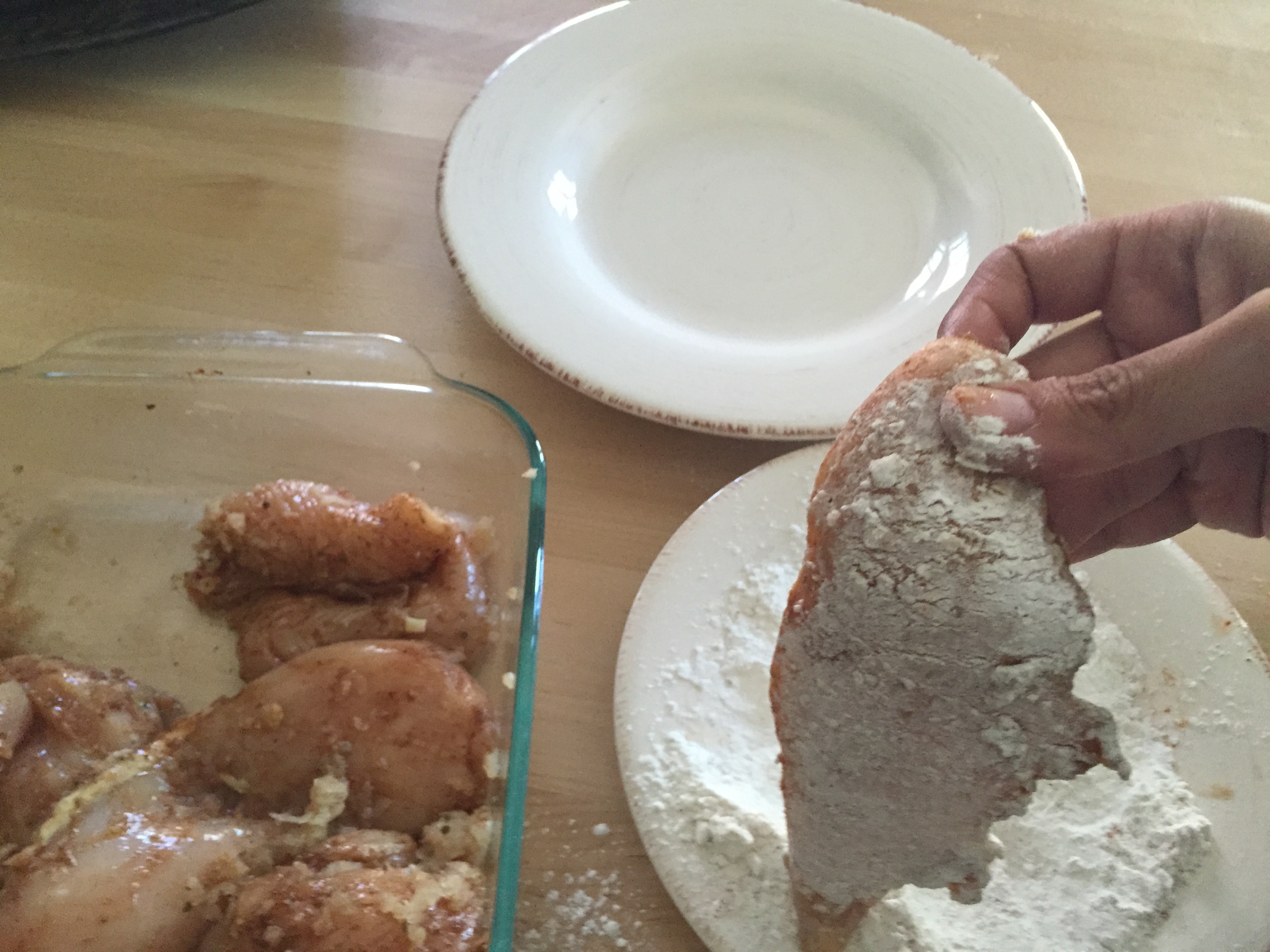 Then do the pattern of FEF: Flour, eggs, Flour. So, cover the chicken with the Flour for both sides. Dip the chicken into the Eggs mixture. Take it out and cover it again with Flour for both sides.