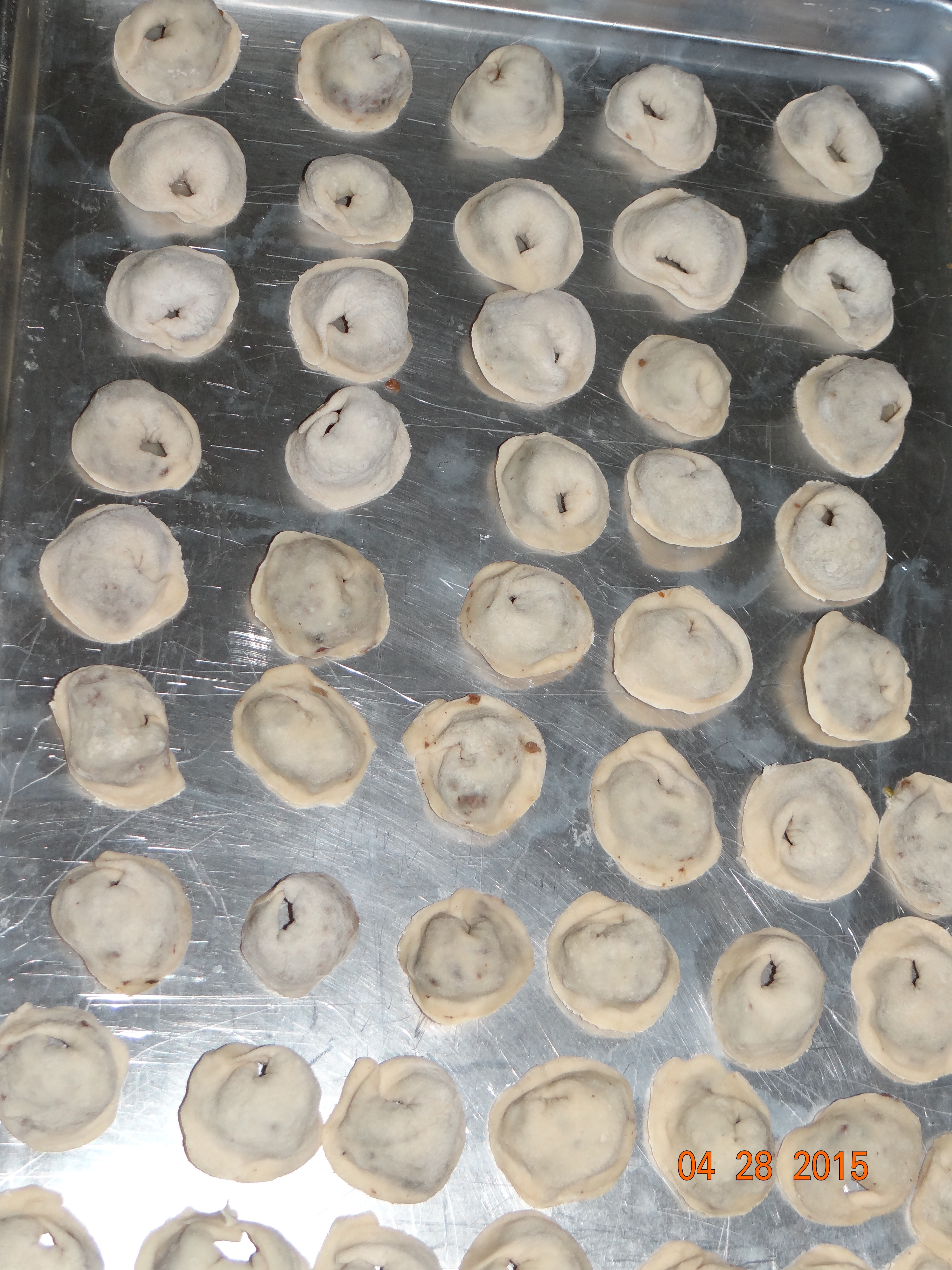 When the meat cools down, start preparing the dumplings. Cut the dough into medium balls and start rolling the dough on a floured surface. Cut the dough into small circles as shown below.