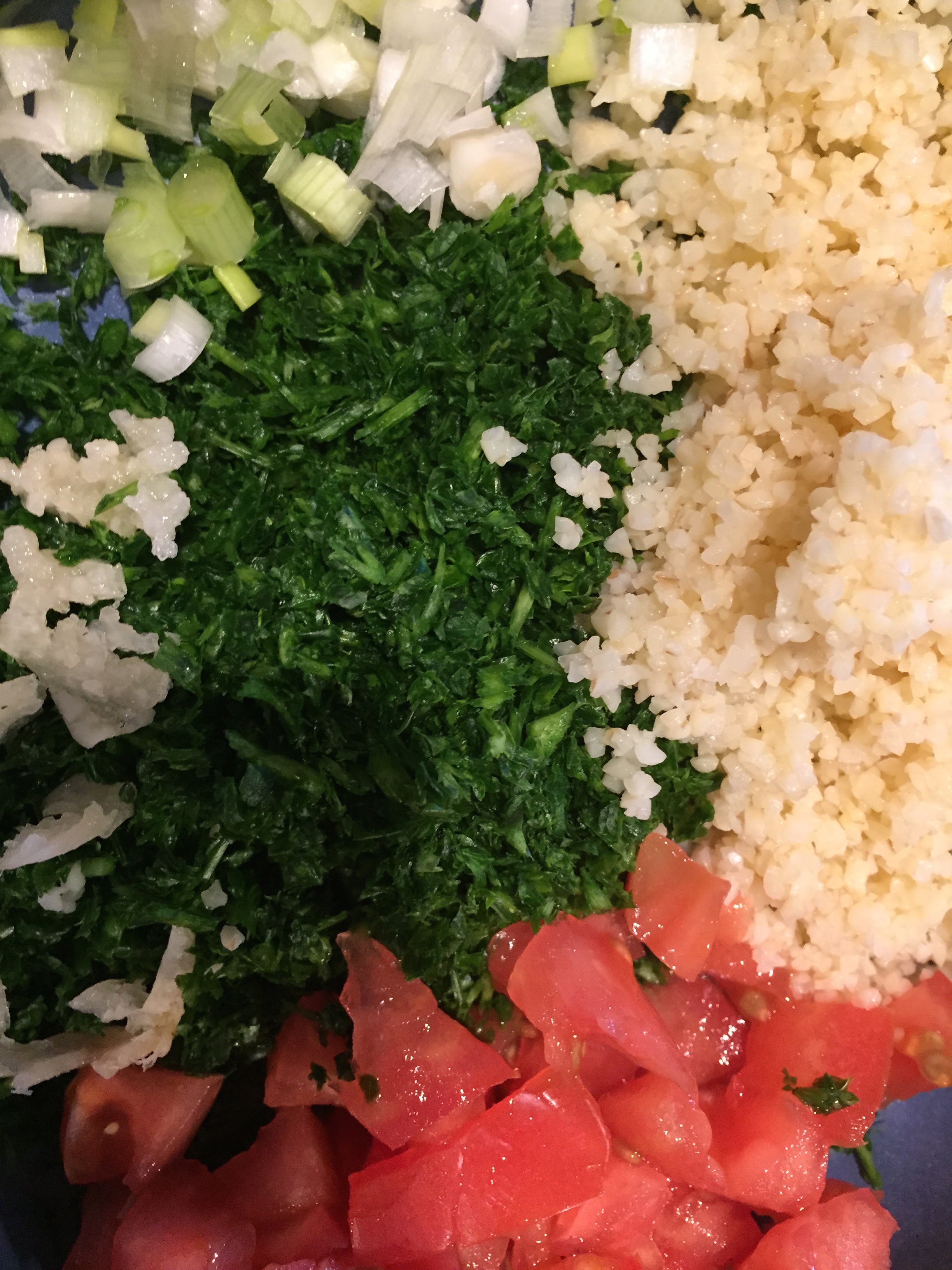 In a bowl, mix all the above with the bulgur, garlic and everything else.