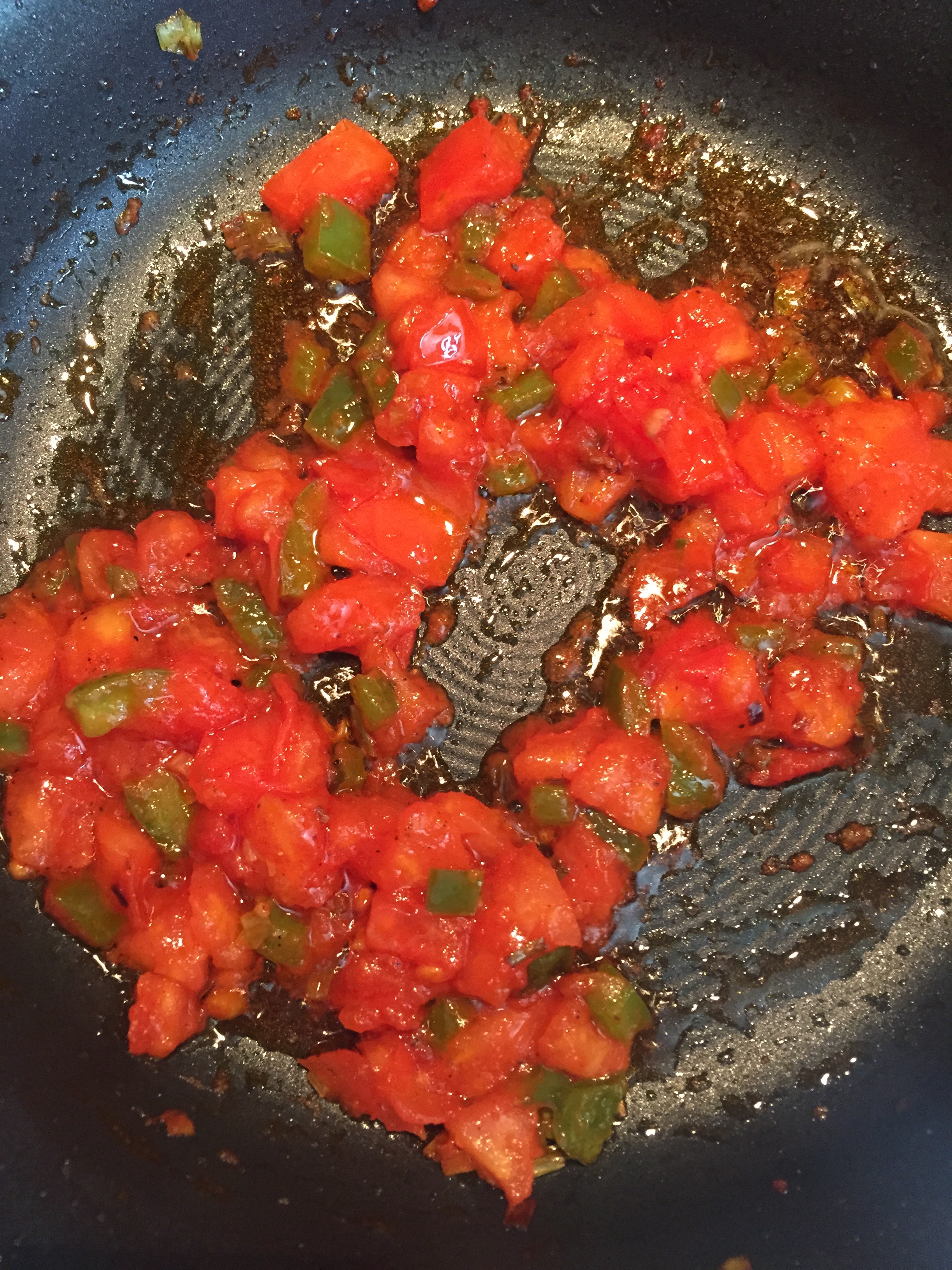 Add the tomatoes and the bell peppers. Add a pinch of salt, pepper and cumin.