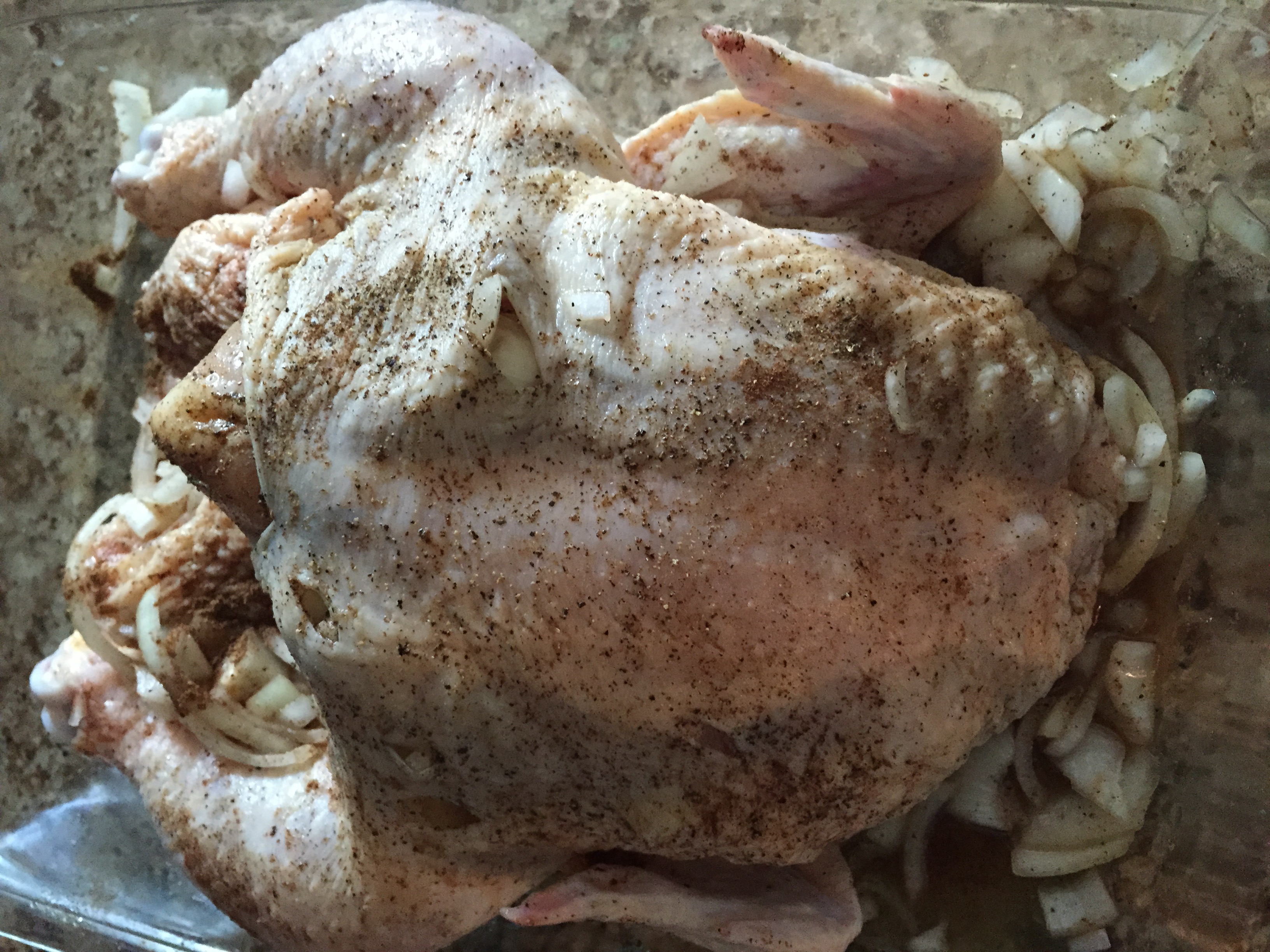 Rub the chicken inside, outside, under and over the skin with some salt, pepper, lime juice and 7 spices.