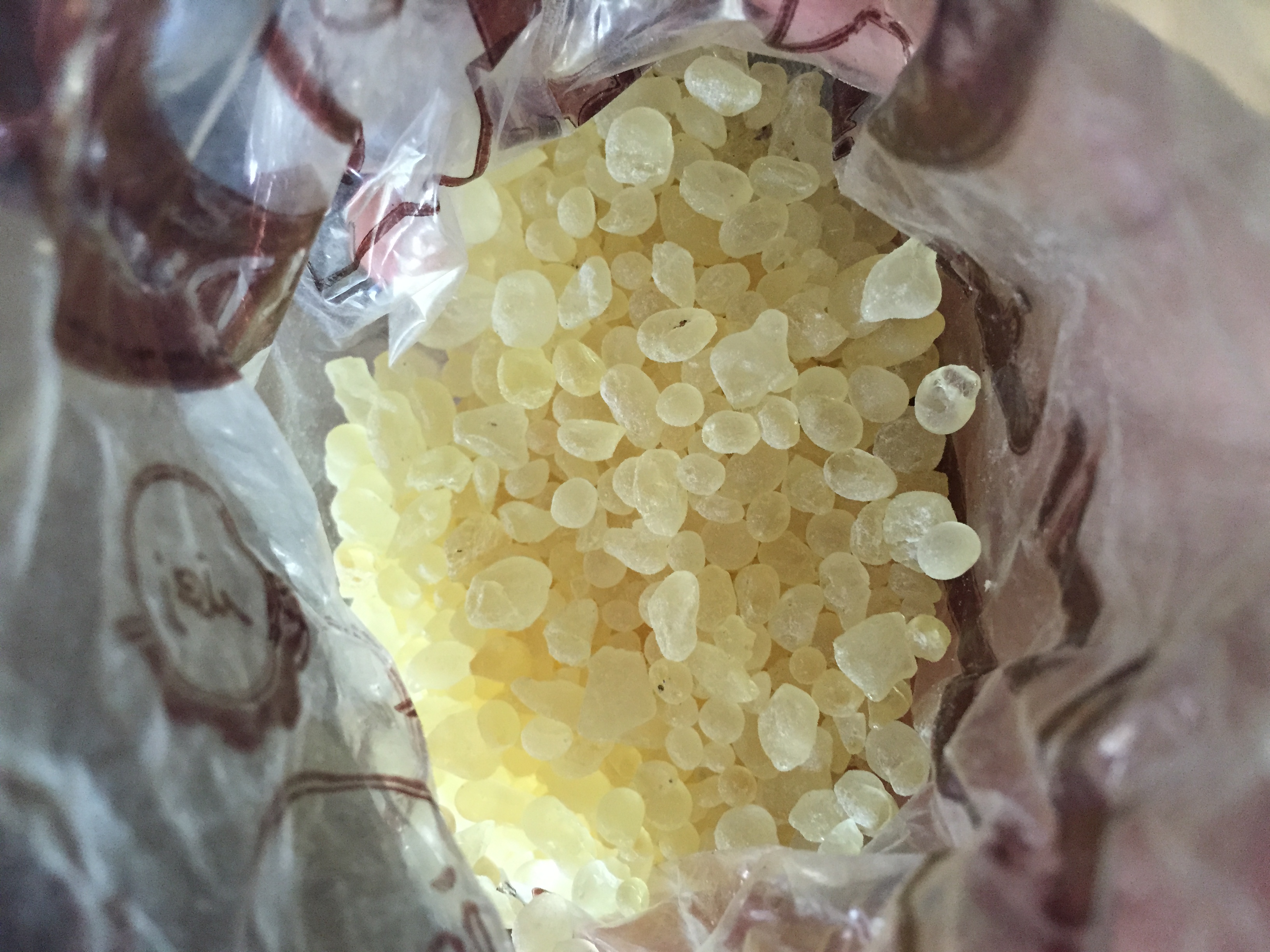 This is how the mastic looks, it is like some little rocks. When they are added to the boiling water, they totally dissolve releasing an amazing smell to the soup!