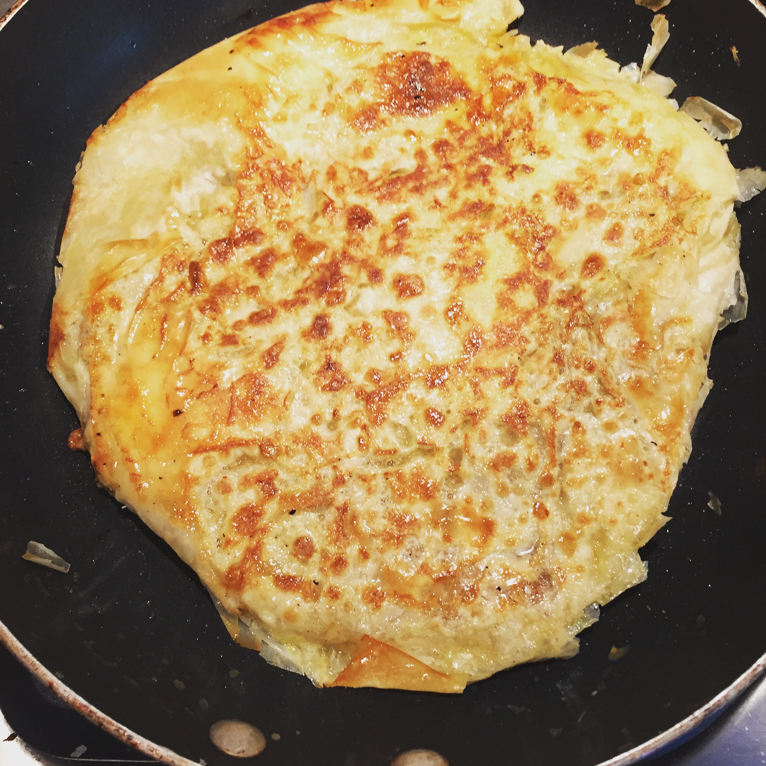 The recipe below is a short cut to create same flavors in a very short time and way less calories. I am not using butter and I am also using the stove top instead of baking the fillo dough in the oven. If you have the stuffing ready, this recipe will not take more than 15 minutes. It will look like individual pies or pastries that are crunchy from outside, softer towards the middle with a surprise stuffing. Enjoy!