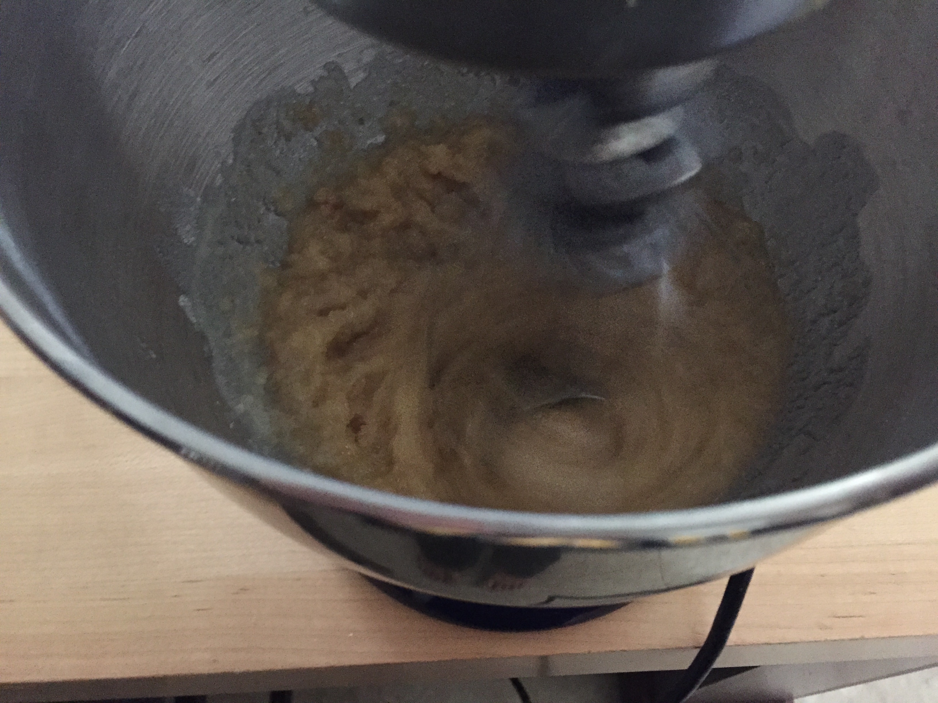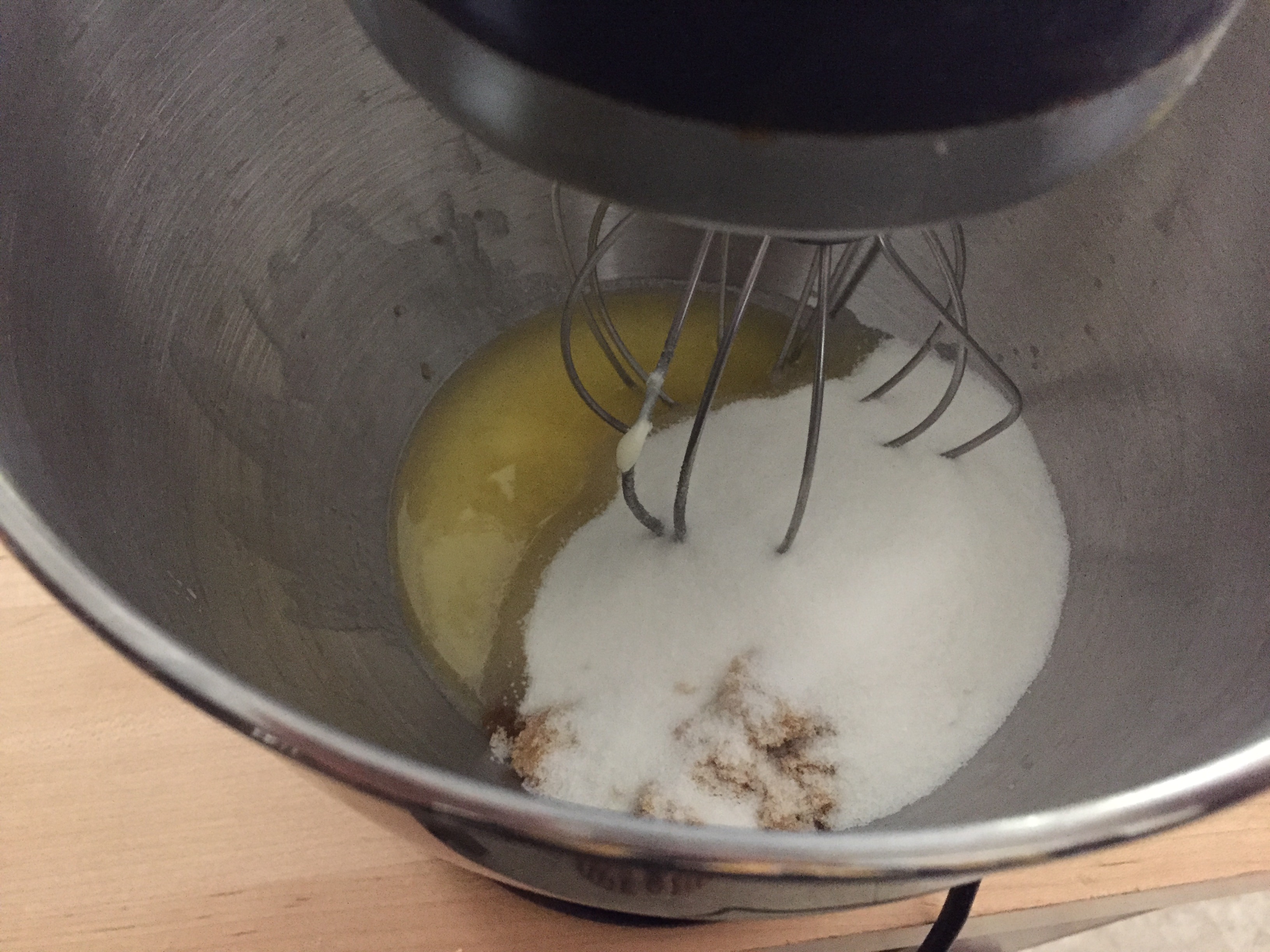 In your kitchen mixer or with your great power, beat the sugar, butter (not fully melted and at room temp.) and vanilla until they mix very very well.