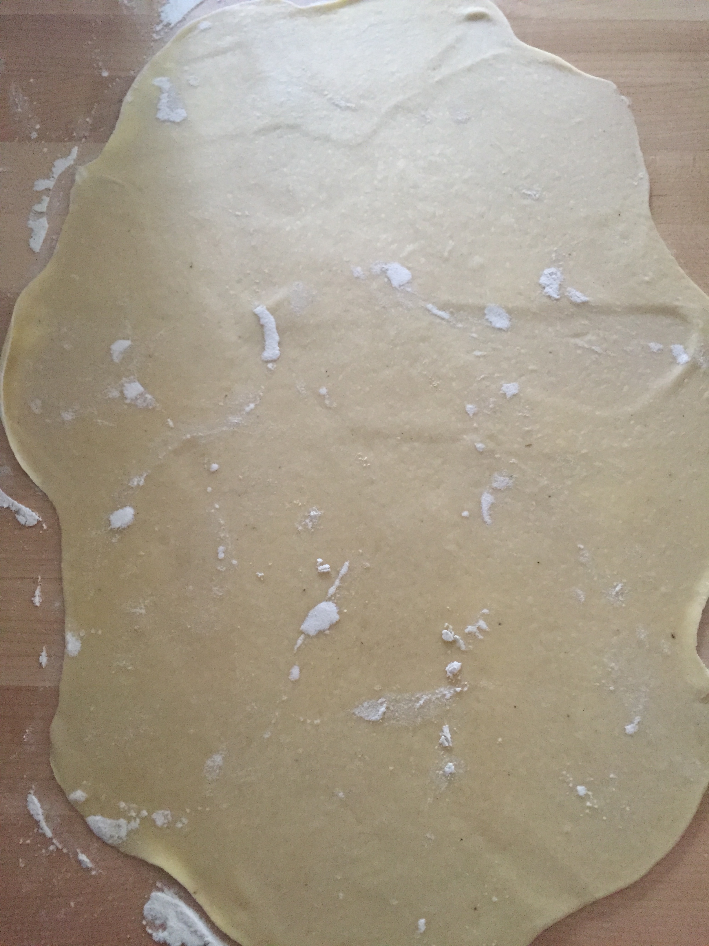 Take a good piece of the dough and flat it on a floured surface with the roller.