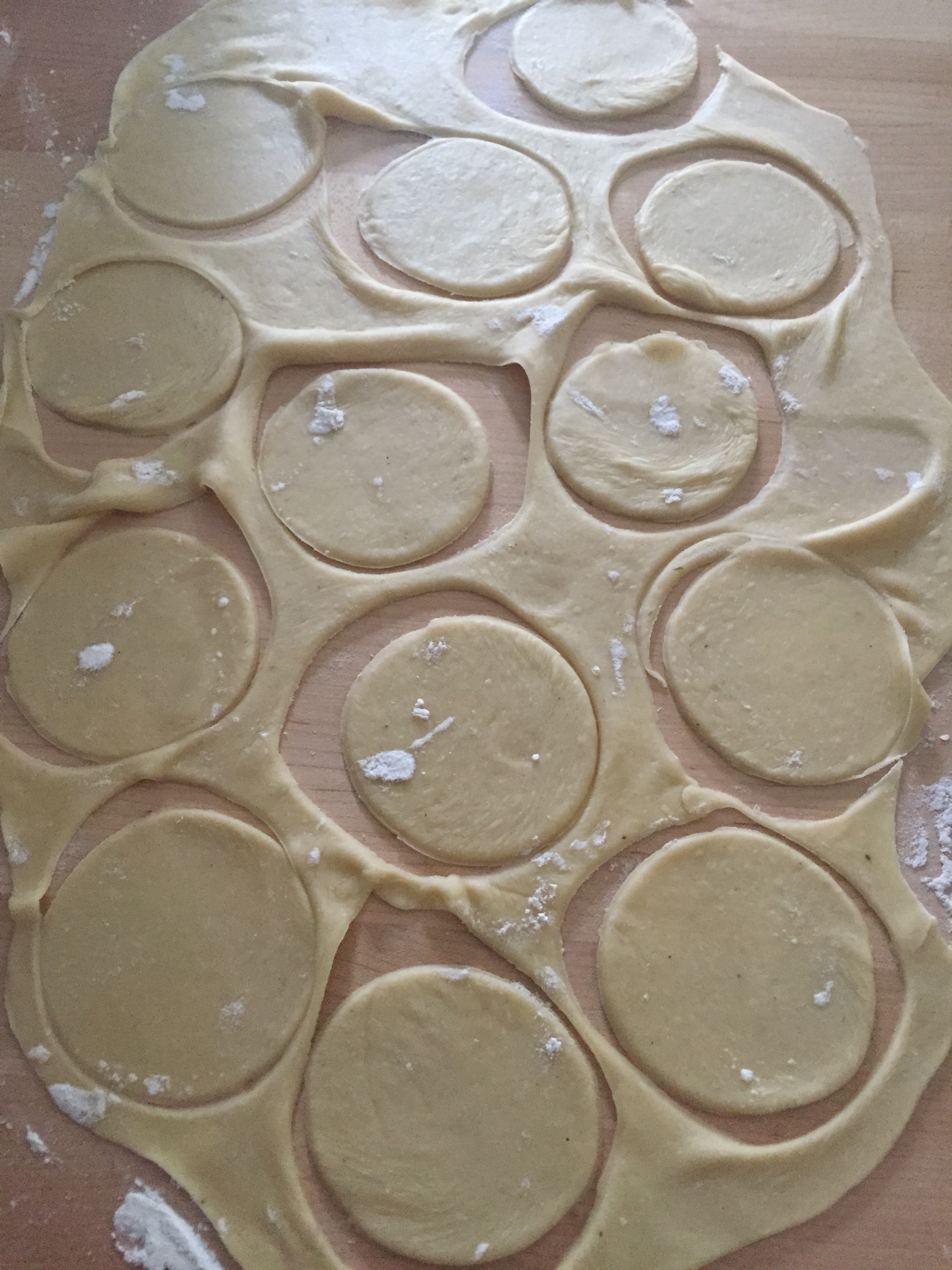 Cut the dough into medium circles using those circle cutter tools or turn down a glass and squeeze it against the dough.
