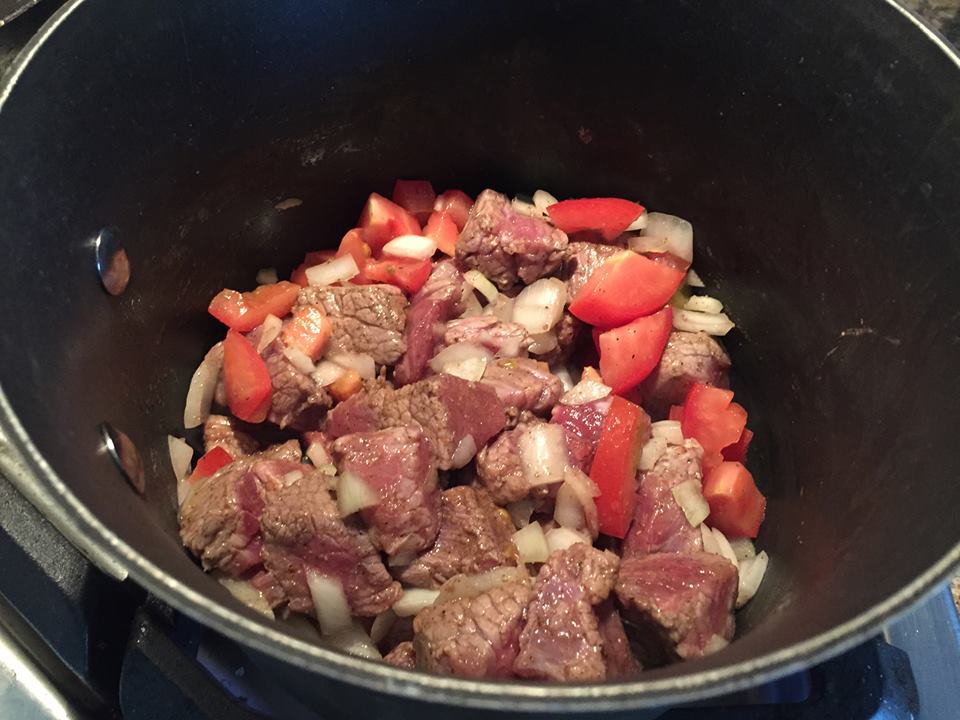 Stir the meat with the tomato paste a couple of times to cover the meat with the tomato paste.