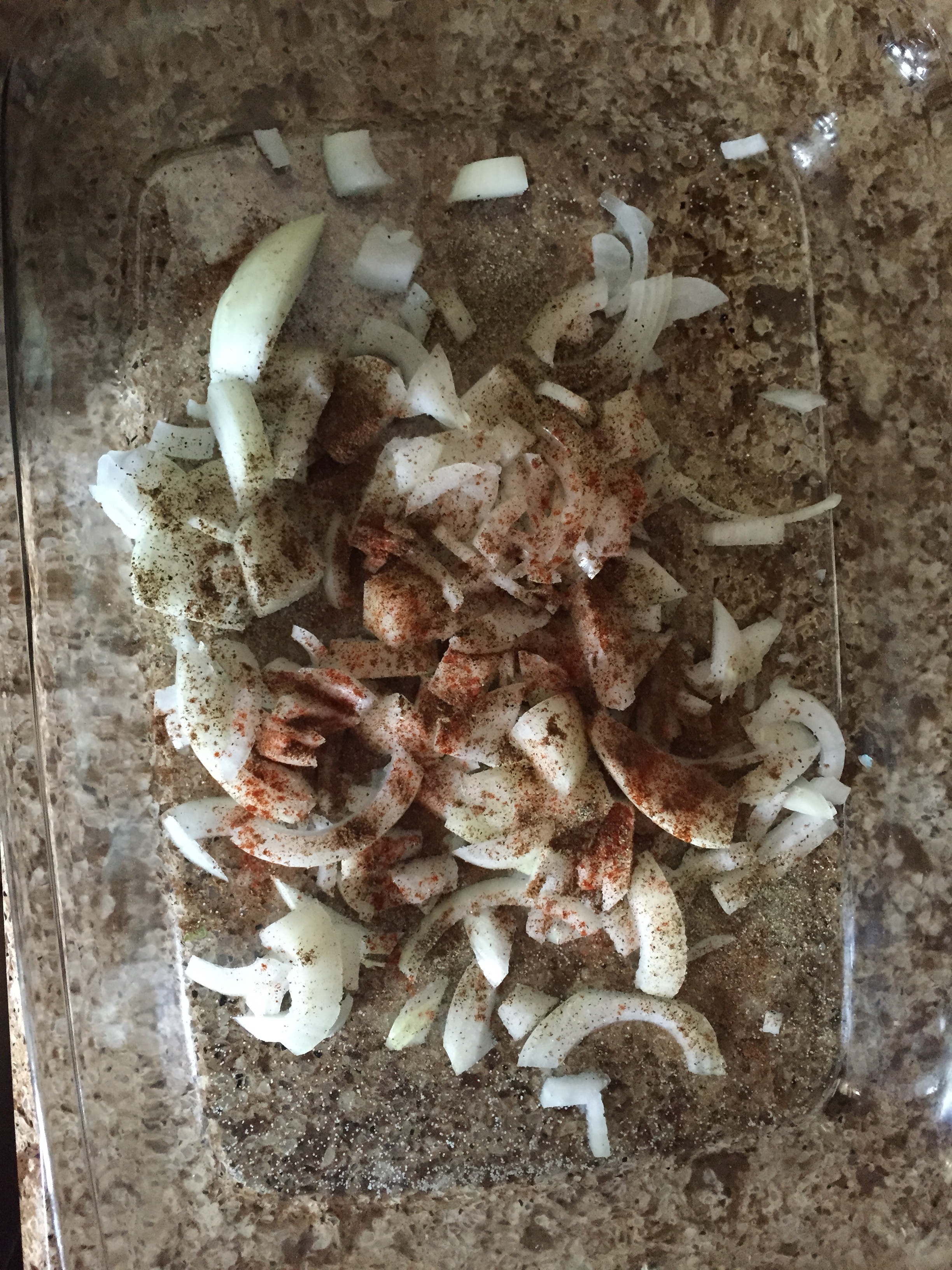 In a medium bowl, mix the chopped onions with paprika, salt and pepper, rub well.