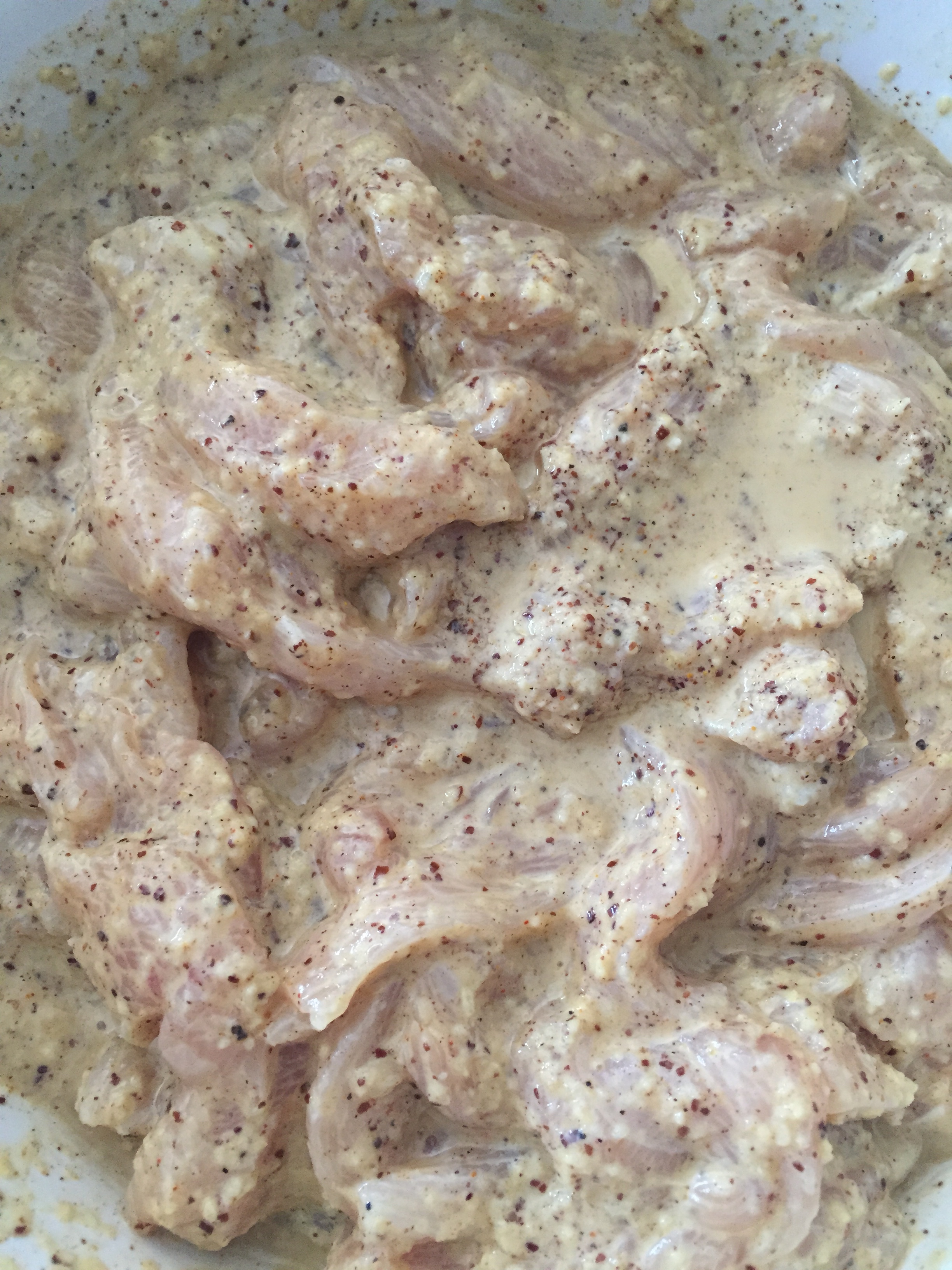 Prepare the marinate (all mixed in the kitchen machine): onion + 1 cup of greek yogurt + lemon juice + vinegar, Sumac and spices like shawerma spice+ paprika + salt and pepper + 1 tablespoon olive oil. Mix them all together.