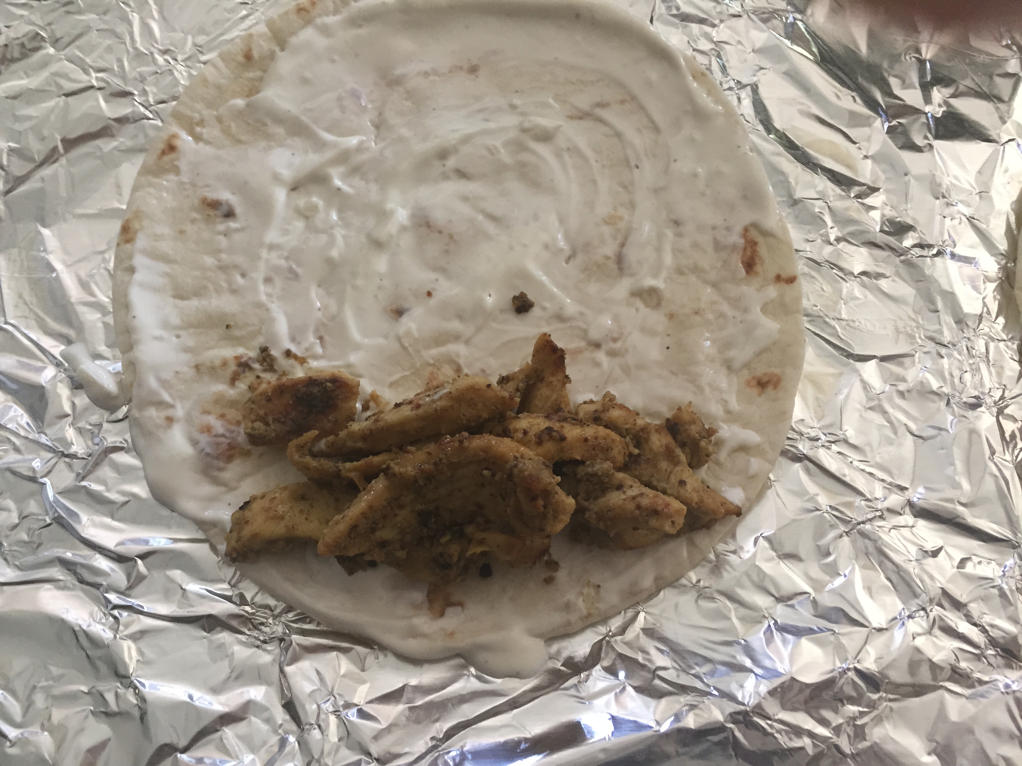 In a hot pan on medium low heat, put the shawarma wrap with the folded piece facing the olive oil.