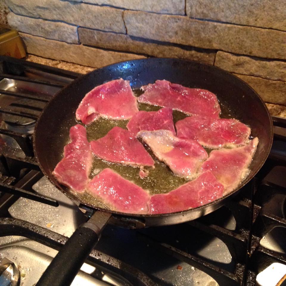 Add the beef cutlets to brown on one side then flip to the other side after a couple of minutes.