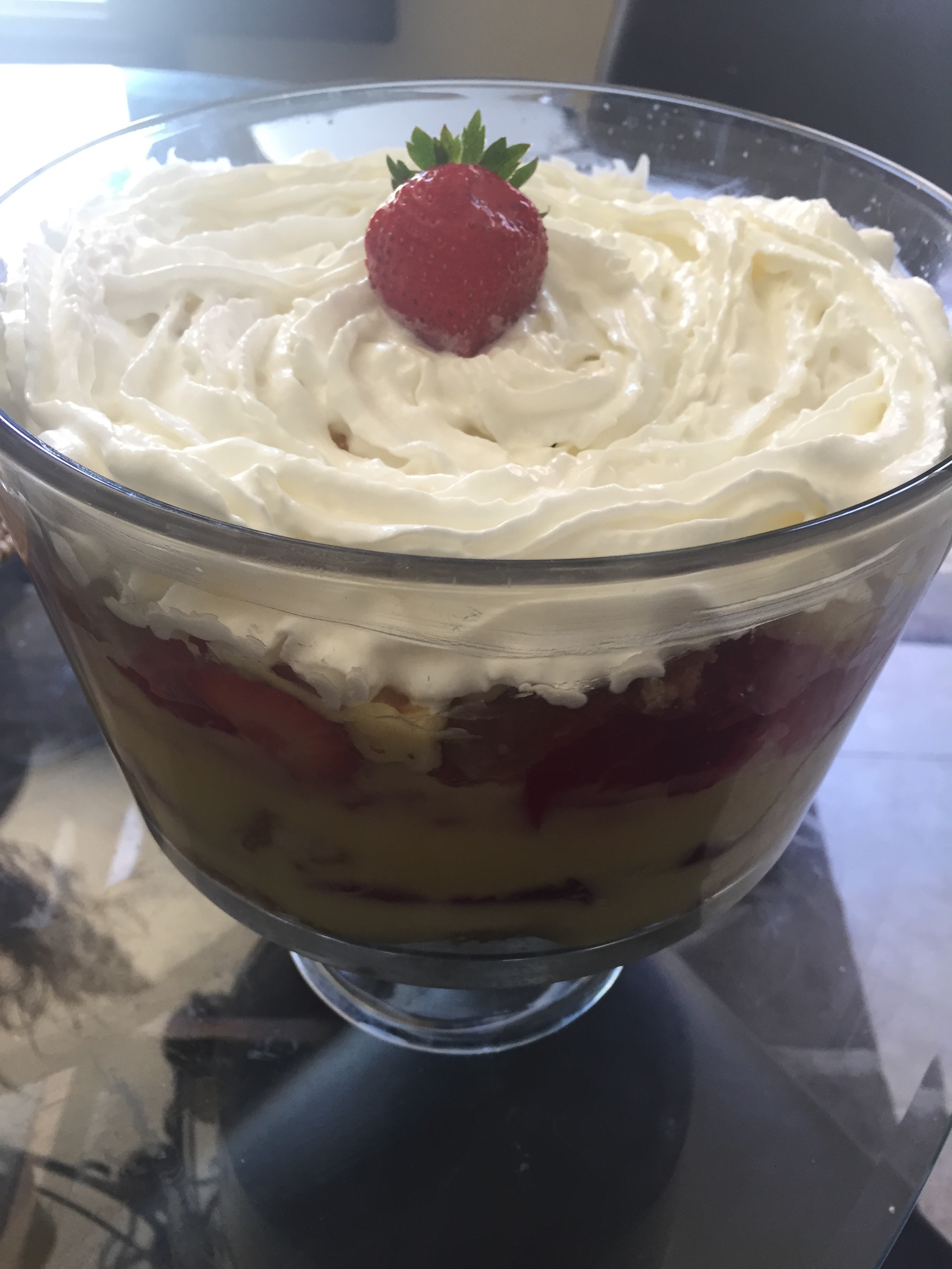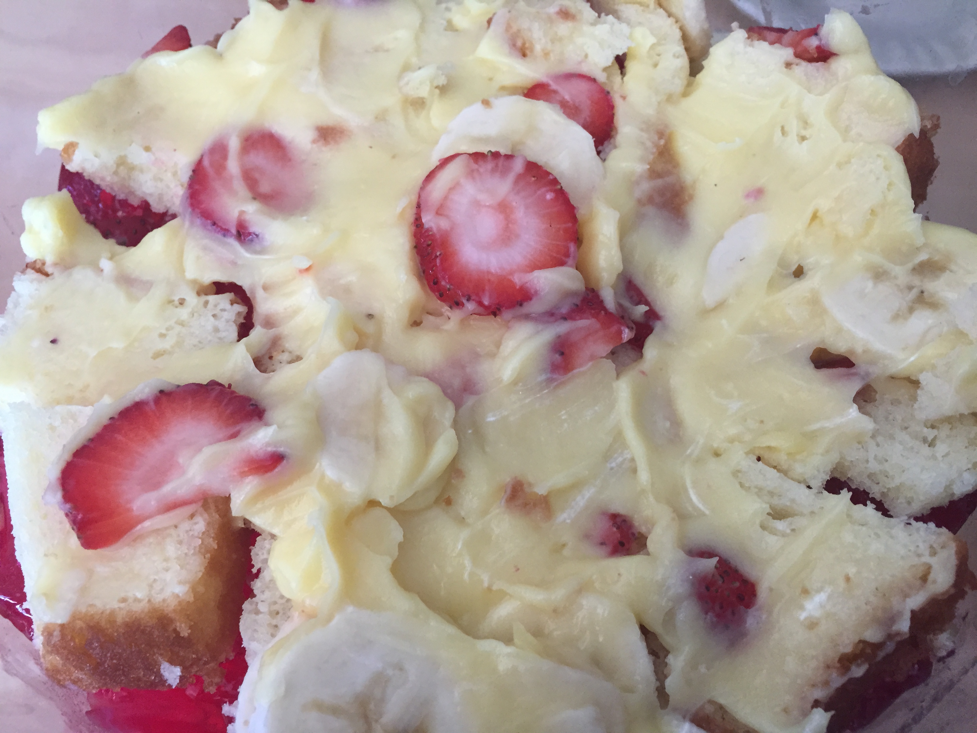 I was invited 20 years ago to my one of my best Egyptian friend’s birthday. Her mom, May Allah bless her soul, used to make for her birthday every year the trifle. It is originally English and it is layers of sponge fingers or cake, custard, jam and fruits. In Egypt, we do not use the Jam, we use instead the Jello. In my opinion, this is the best dessert for big gatherings and parties, since you can get all its ingredients off the shelf and can be super easily prepared. Hope you like it!