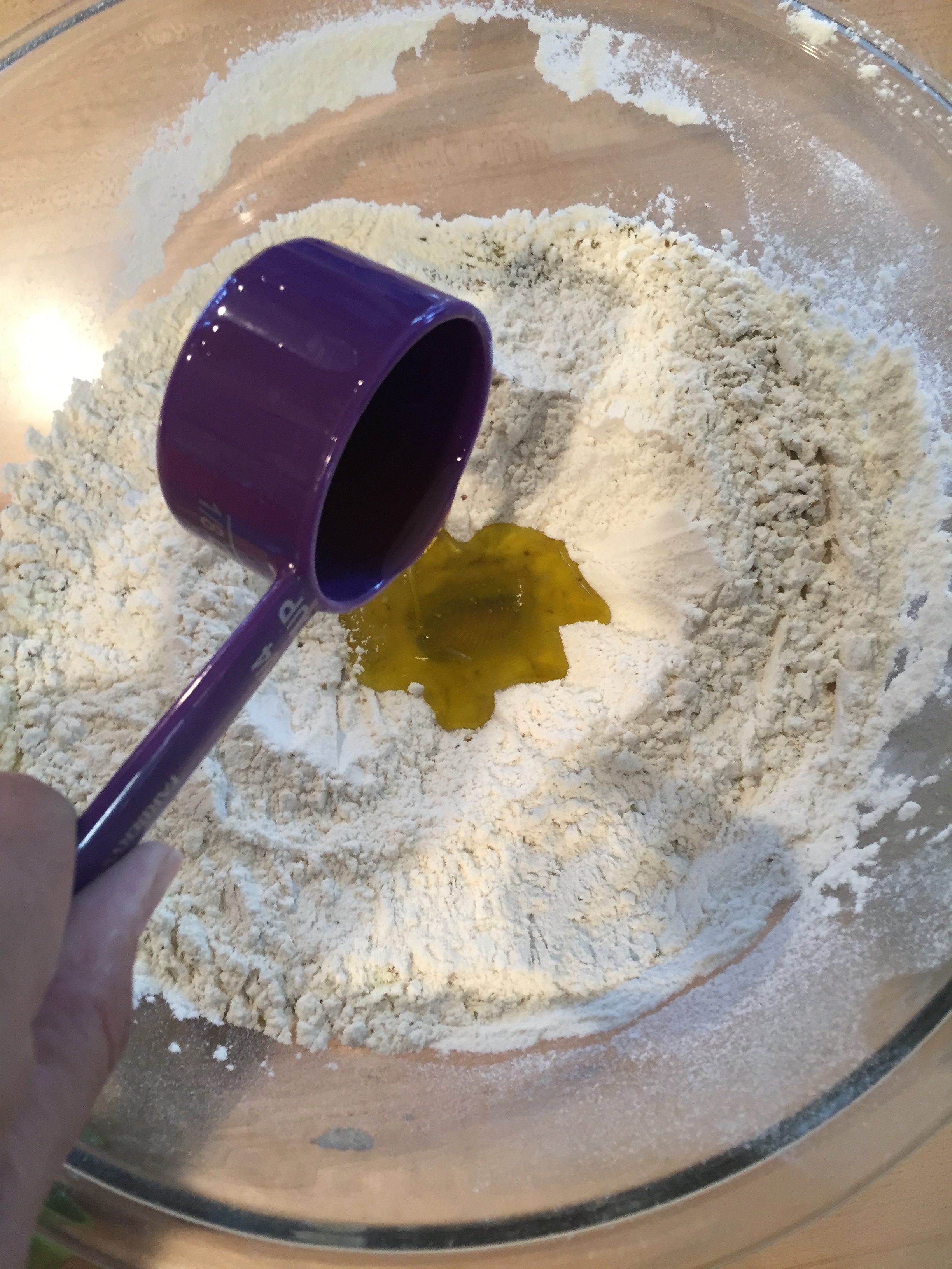 Add the yeast mix and 1/3 cup of the olive oil to the flour and mix it.