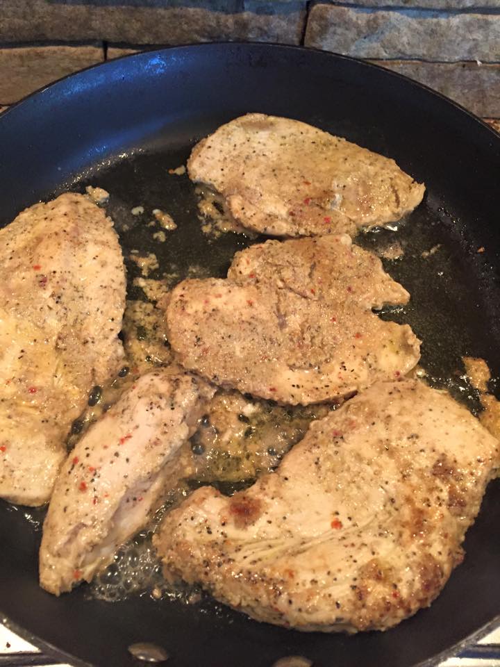 Add the chicken. We will just give the chicken some color and take it off the heat and set it on a plate. It will finish its cooking in the oven.