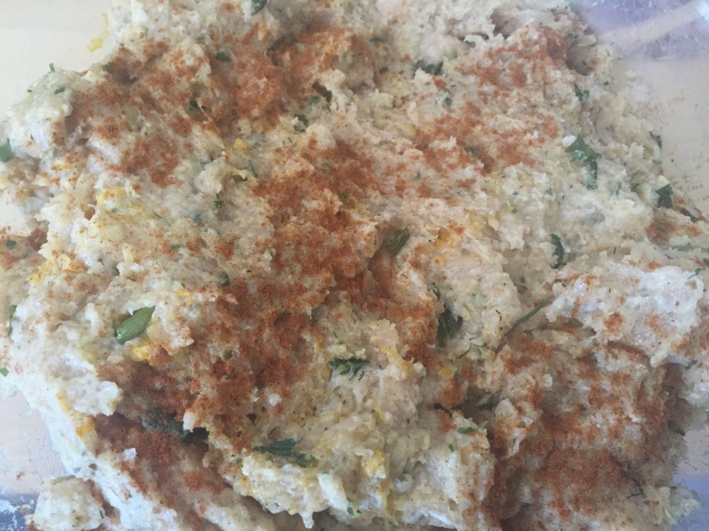Using the food processor, ground the chicken. Add all the above ingredients and mix with the chicken, set in the fridge for 30 minutes.
