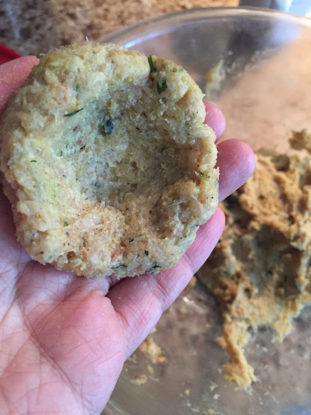 Take a good piece of the ground chicken mix in your palm and flatten it as below.