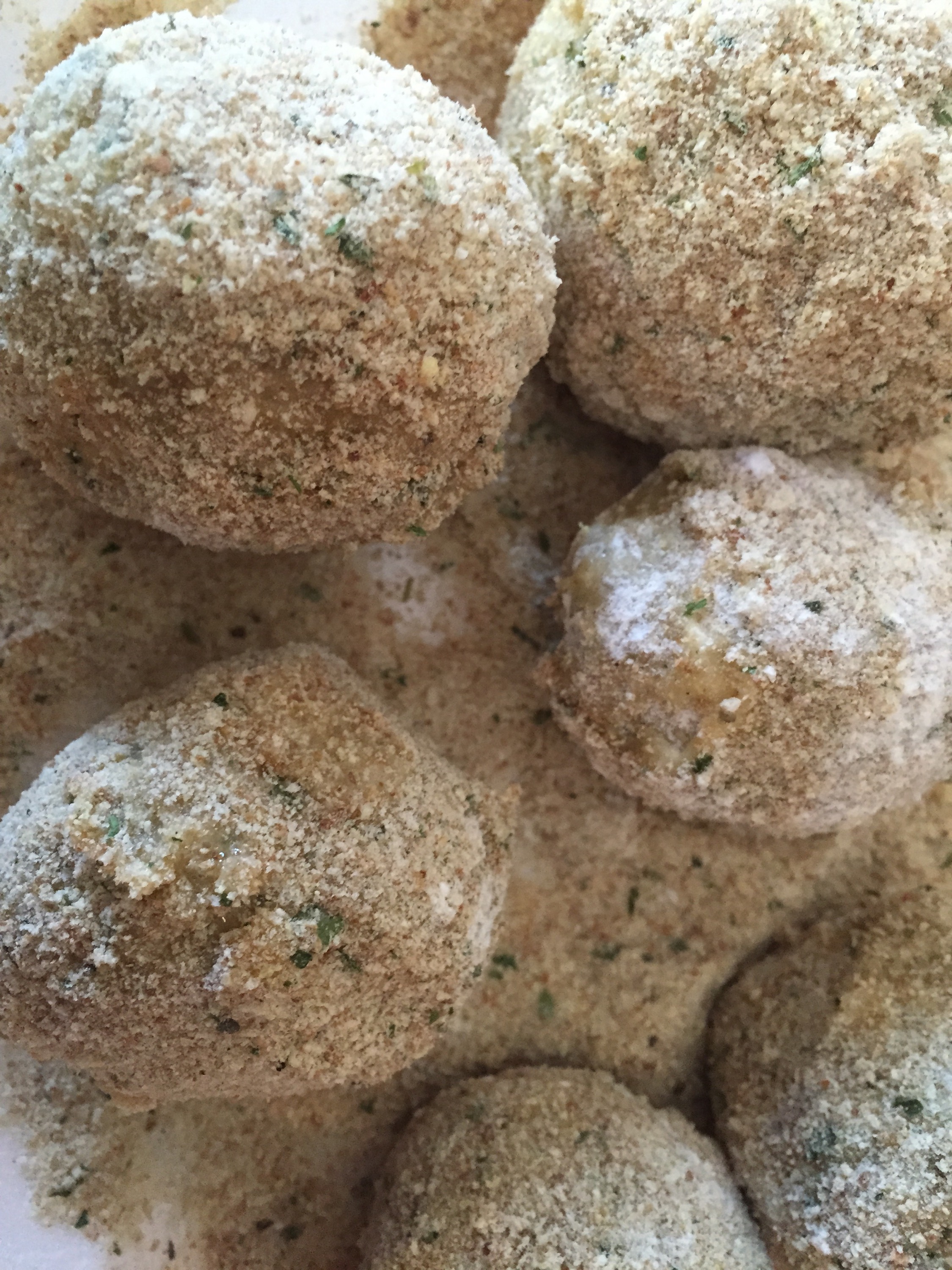 Then follow the pattern of FEB: dip the chicken balls in flour, then eggs then breadcrumbs.