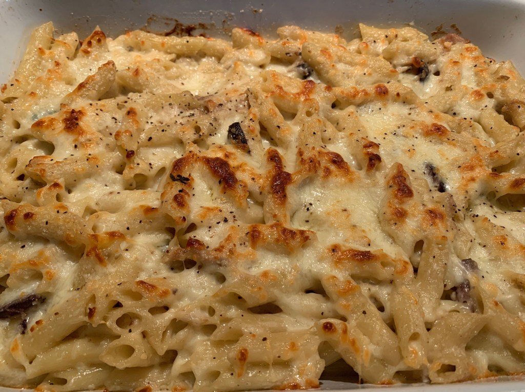 Move the saucy mix of pasta to a tray sprayed with Pam or a bit of olive oil