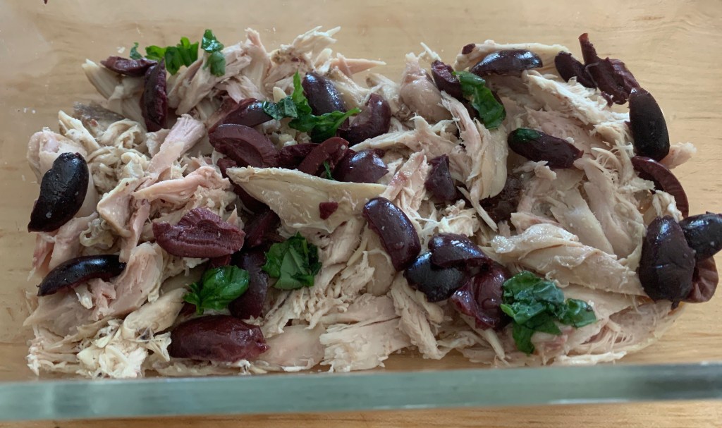 In a large deep plate: combine left over chicken, olives, cut basil leaves, mushrooms if any